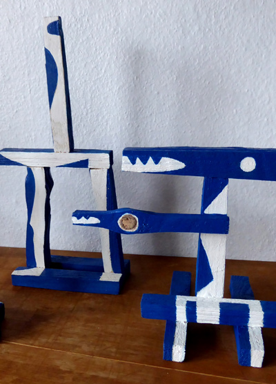 Gleichsam wie auf Inseln lebend bewegen sich Figuren und Formen im Kleinen der persönlichen Annäherung, wie auch im Großen der Verschiebung von Erdteilen freundlich aufeinander zu. Die vier Einzelwerke können für sich betrachtet werden, sie drängen jedoch zugleich darauf, miteinander zu kommunizieren; bewusst sind die vier Regenbogenfarben als Grundfarbtöne gewählt, die sich zu einem Farbkreis zusammenfinden wollen.